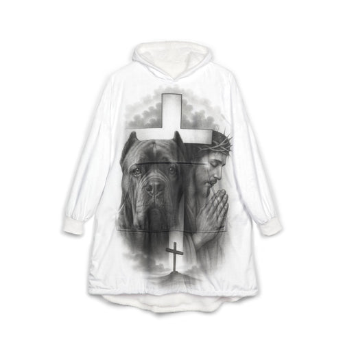 Christian Jesus & Cane Corso Hooded Blanket — Praying Christ with Cross and Dog Comfort Throw